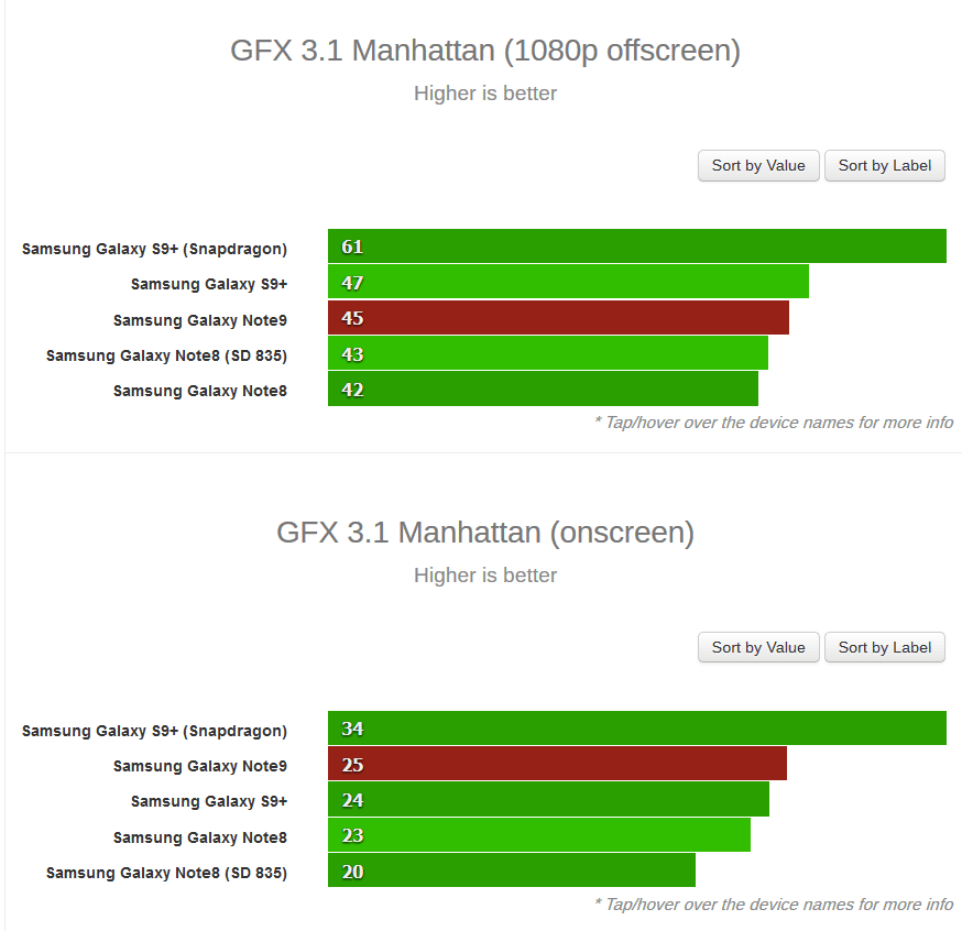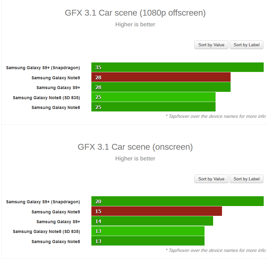بر اساس تست های انجام شده توسط فون آرنا، گلکسی نوت 9 به جز یک مورد در هیچ رشته ای نتوانسته رقیب قدیمی تر خود یعنی گلکسی اس 9 پلاس را شکست دهد. این در حالیست که انتظار می رفت سامسونگ بتواند با معرفی سیستم خنک کننده کربنی جدید عملکرد روان تری را برای پردازنده تضمین کرده و در نتیجه حداقل در بنچمارک ها امتیاز بالاتری کسب کند. بنچمارک های GFX که عملکرد گرافیکی دستگاه را بررسی می کنند همگی نشان می دهند نوت 9 تقریبا 25 درصد وضعیت بهتری نسبت به نوت 8 دارد اما باز هم در مقام پایین تری از اس 9 پلاس قرار می گیرد.
