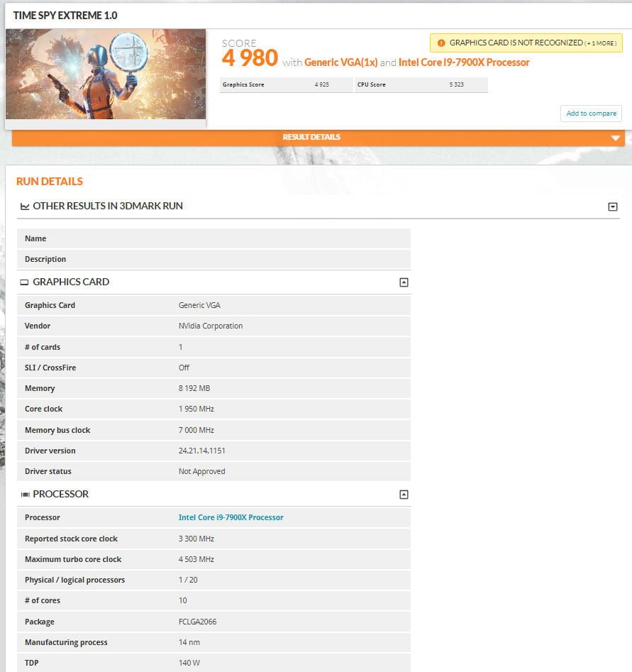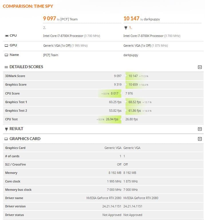 به تازگی شاهد انتشار رسمی بنچمارکهای کارت گرافیک های RTX 2080 و RTX 2080 Ti در بازی ها بوده ایم؛ اینک به سراغ بنچمارکهای لو رفته از بنچمارک 3DMARK در بخش های Time Spy و Fire Strike هستیم. این بنچمارکها به تائید هیچ وب سایت رسمی و انویدیا نرسیده و از صحت آنها مطمئن نیستیم. همچنین این بنچمارک ها که از کارت گرافیک RTX 2080 برآمده اند، نزدیک به امتیازهای GTX 1080 Ti هستند. با این وجود این معیارها توان کلی کارت گرافیک ها را نشان نمی دهد.