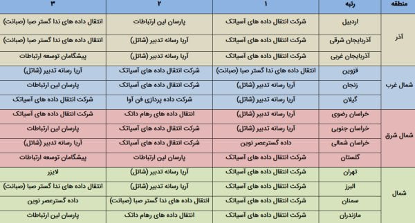 توضیح اینکه جدول فوق بر اساس جدول ارائه شده توسط سازمان تنظیم مقررات از سوی وب سایت سخت افزار تنظیم شده و شیوه امتیازدهی به شرکت ها به این ترتیب بوده است که 30 امتیاز برای قرار گرفتن در رده اول بهترین سرویس دهنده هر استان، 20 امتیاز برای رده دوم و 10 امتیاز برای رده سوم در هر استان کشور اختصاص داده شده و سپس با جمع بندی امتیازات در همه 31 استان کشور، 5 سرویس دهنده برتر اینترنت ایران شناخته شده اند. همچنین جدول بهترین سرویس های اینترنتی به تفکیک هر استان که توسط سازمان تنظیم مقررات منتشر شده نیز به صورت زیر می باشد: