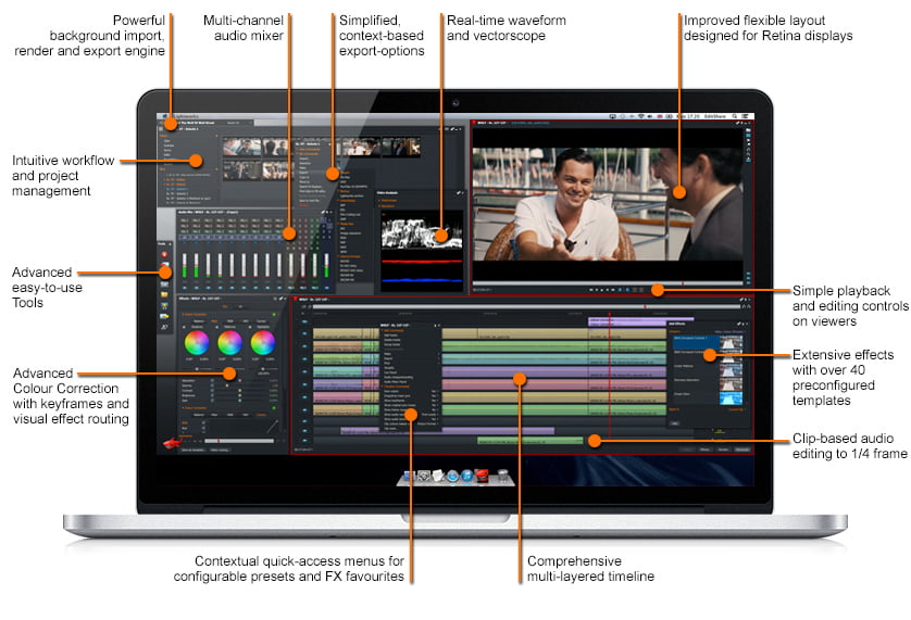 گر چه امکانات همه این نرم افزار ها تقریبا مشابهه ولی سیستم بسیار قدرمتند gpu acceleratin اون و استفاده فوق العاده عالی اون از منابع سخت افزاری شاید بی رقیب باشه و سیستم color grading این نرم افزار بی نظیره و کنترلش بسیار راحته اونم به خاطر سیستم node base . و پلاگین های زیادی داره ( البته نه به اندازه Premier Pro) که میشه به پلاگین های شرکت red giant , new blue fx , gen art و …. اشاره کرد. از مزیت های دیگه این نرم افزار export , import از و برای final cut pro و Premier Pro هست و میتونید سیستم hotkey های خودتون رو به avid یا Premier Pro و یا final cut pro تغییر بدید و برای switch کردن دیگه به مشکل بر نمیخورید . این نرم افزار بدون نیاز به پلاگین از زبان فارسی به راحتی پشتیبانی میکنه . از تمامی سیستم های render box و render farm تا هر حجمی پشتیبانی میکنه ( که البته باید نسخه surface panel رو داشته باشد ) و دارای سیستم key framing بسیار خوش ساختیه و در آخر هم اینکه این نرم افزار رایگانه !!!