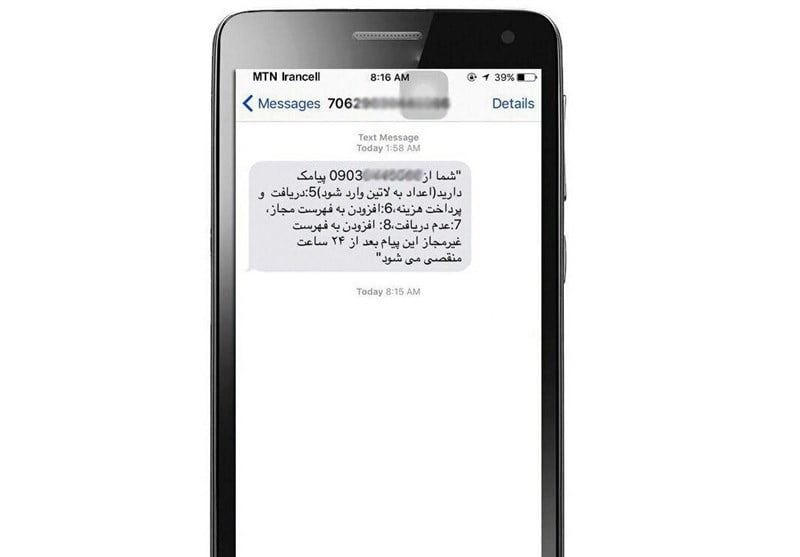 «شما از 09 XXXXXXXXX پیامک دارید (اعداد به لاتین وارد شود) 5:دریافت و پرداخت هزینه 7:عدم دریافت 8:افزودن به فهرست غیر مجاز»