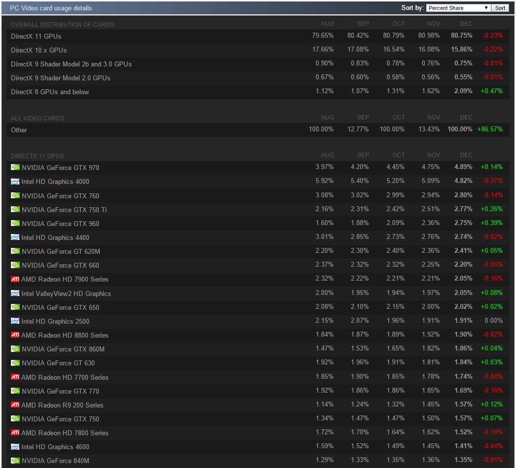 این گزارش تا پایان دسامبر 2015 به روز رسانی شده است.به عبارت بهتر می توان آن را مربوط به سال گذشته میلادی دانست.در این گزارش بیشترین و محبوب ترین کارت گرافیک های مورد استفاده کاربران مشخص گردیده است.در رتبه اول این جدول،کارت گرافیک GTX 970 قرار دارد.شاید بسیاری انتظار کارت گرافیک GTX 980 را داشتند،اما قیمت متوسط در کنار کارایی نسبتا بالا،سبب محبوبیت و فروش بالای GTX 970 شده است.این کارت گرافیک در یک رشد صعودی از ماه آگوست تا دسامبر،موفق به کسب رتبه اول در بین کاربران استیم شده است.بدین ترتیب IGPU های اینتل،ابتدای جدول را به یک رقیب بزرگ واگذار کرده اند.عمده GPU های 10 رتبه برتر نیز به کمپانی سبزها یعنی انویدیا تعلق دارد.وجود کارت گرافیک های نوت بوک در این آمار،نشان از افزایش تمایل کاربران به استفاده از لپ تاپ به منظور بازی دارد.
