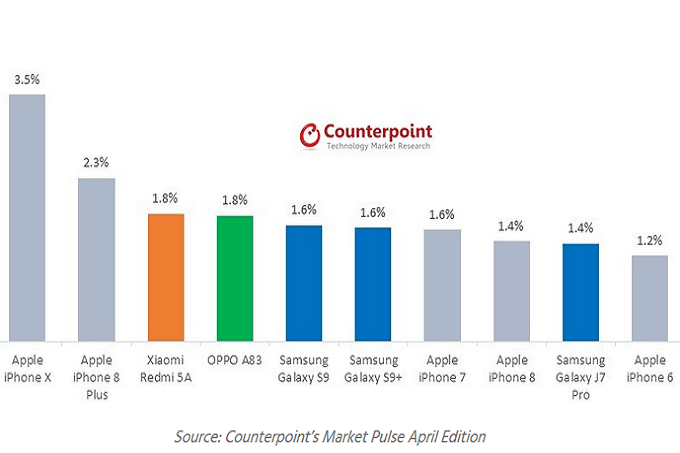 بر اساس بررسی هایی توسط سایت Counterpoint در ماه مارس، لیست گوشی های برتر در بازار فروش اخیر معرفی شدند. در این میان iPhone X در ماه های اخیر 3.5 درصد از بازار گوشی های هوشمند را به خود اختصاص داد و در جایگاه اول فروش قرار گرفت. در این رتبه بندی شاهد iPhone 8 با 2.3 درصد در جایگاه دوم هستیم و جایگاه سوم برای اولین بار در تاریخ به گوشی هوشمند Redmi 5A از شیائومی با 1.8 درصد اختصاص داده شد.