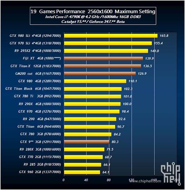در دقت تصویر 4K دو کارت گرافیک R9 390X و Titan X تقریبا عملکردی نزدیک به هم را نشان می دهند که در این رقابت R9 390X کمی سریعتر ظاهر شده است. اما در مورد مقایسه عملکرد کارت GTX 980 Ti یا همان GM200 cut با کارت R9 390X ، می توان اختلاف محسوسی را به نفع ای ام دی مشاهده کرد. در پایین تصویر هم عملکرد کارت موسوم به GTX 9** به چشم می خورد که اگر اسم آن را GTX 960 Ti بگذاریم، ارتقاء نسبتا خوبی را در مقایسه با GTX 960 با خود به همراه داشته است.