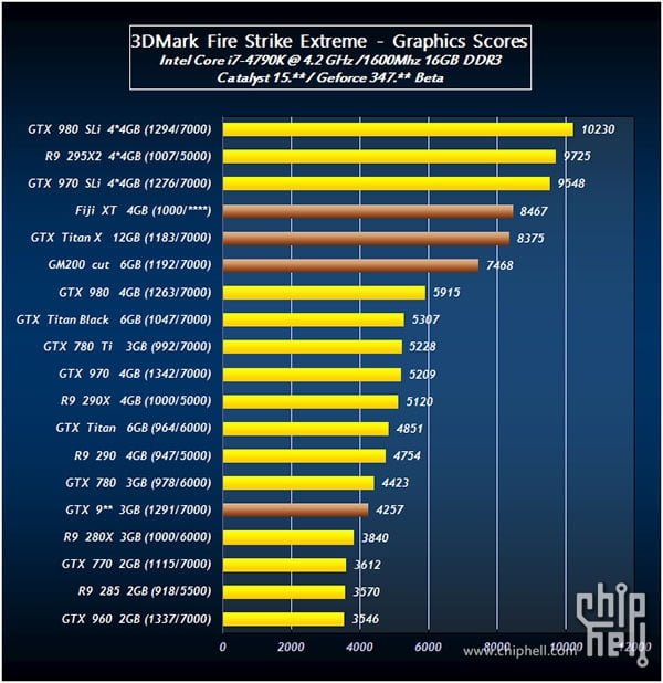 اخیرا در چندین وب سایت مطرح حوزه سخت افزار تصاویری بدست آمده که مقایسه عمکلرد بین کارت های گرافیک پرچمداری را نشان می دهد که قرار است در آینده ای نزدیک عرضه شوند. منبع اصلی این بنچ مارک ها طبق معمول وب سایت چینی Chiphell می باشد و احتمال دارد که اعداد و ارقام مشخص شده در این تصاویر دور از واقعیت باشند. بر اساس اطلاعات منتشر شده همراه این بنچ مارک ها ، اینطور گفته شده که انویدیا قصد دارد یک کارت گرافیک جدید GeForce GTX را مبتنی بر نسخه ضعیف شده تراشه گرافیکی GM200 معرفی کند که به احتمال خیلی زیاد GTX 980 Ti خواهد بود. همچنین در این تصاویر می توان عملکرد کارت گرافیک جدید دیگری که گفته می شود احتمالا GTX 960 Ti باشد را هم مشاهده نمود. همانطورکه در تصاویر مشخص شده برای انجام تست ها از سیستمی با پردازنده مرکزی Intel Core i7-4790K و فرکانس 4.2 گیگاهرتز و 16 گیگابایت حافظه رم DDR3 با فرکانس 1600 مگاهرتز استفاده شده است.