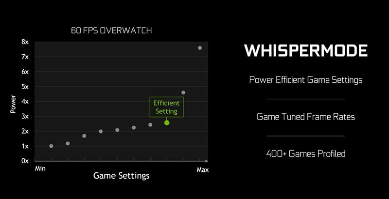 به عبارت ساده تر، GPU در یک مرحله از کار خود، زمانی که در زیر فشار پردازش قرار می گیرد، تا یک مرحله میزان انرژی را مصرف و طلب می کند که با بار پردازشی و پرفورمنس آن همخوانی دارد؛ اما از یک مرحله به بعد، توان مصرفی و حرارتی بیش آن است که از آن چشم پوشی کرد. در نتیجه می توان یک مرحله خاص را برای کارت گرافیک تعرفی نمود که در این سقف متوقف گشته و فرکانس ولتاژ را افزایش ندهد. در این حالت GPU حداکثر کارایی خود را نسبت به ولتاژ و جریان مصرفی ارائه می دهد. این مسئله گرمای ایجاد شده در شاسی را کاهش داده و یک کارت گرافیک GTX1080 می تواند در یک شاسی GTX1060 نیز جای گیرد! و اما این فناوری تنها جنبه سخت افزاری ندارد؛ NVIDIA با توسعه دهندگان بازی و تولید کنندگان موتورهای بازی در حال رایزنی برای بهبود عملکرد در کارت گرافیک های تکنولوژی MAX-Q است. در حال حاضر یکی از جنله های نرم افزاری تکنولوژی MAX-Q را یک فناوری با نام WhisperMode است. در این وضعیت، اکثر تنظیمات گرافیکی قدتمند اعمال گشته و نرخ فریم به صورت هوشمند تنظیم می گردد. در این وضعیت حتی صدای نویز خارج شده با تصاویر ارائه شده نیز هماهنگ می گردد. WhisperMode دارای بیش از 400 پروفایل از پیش تعیین شده است.