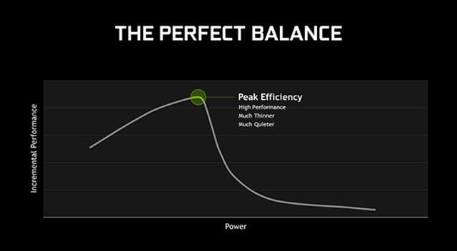 در ابتدا با واژه MAX-Q آغاز می کنیم؛ این واژه یک اصطلاح مهندسی برگرفته از صنایع هوا و فضا است. معنی اصلی آن حداکثر فشار دینامیکی است. مکس کیو نقطه ای است که فشار ناشی از فرود فضاپیمای به دلیل کاهش چگالی جو در اطراف آن افزایش می یابد. پس از آن می توان تائید کرد که موشک حداکثر فشار را تحمل کرده است. انویدیا این اصطلاح را به لپ تاپ های بسیار باریک تشبیه کرده است که می توانند در برابر پردازش های سنگین مقاومت کرده و از پس آنها برآیند. تکنولوژی MAX-Q دلالت بر نوت بوک های بسیار باریک و خنک کننده های خاص دارد. بسیاری از نوآوری های مهندسی در آن قابل لمس و مشهود است. عملکرد هر کارت گرافیک با تکنولوژی MAX-Q می تواند حداکثر تا 10% کمتر از مدل های مشابه در کلاس لپ تاپ های بزرگ باشد. پس در نهایت چیزی را از دست نخواهیم داد. کمپانی NVIDIA چند نمودار را برای آشنایی بیشتر در این زمینه در اختیار برخی از رسانه ها قرار داده است؛ در این مرحله نقطه اوج چه از نظر پردازش و چه از نظر بار جریان، افزایش پیدا نمی کند. بنابراین مهندسان انویدیا نقطه ای را در یک شکل موج در نظر می گیرند که GPU بالاترین کارایی را نشان داده و این در حالی است که اضافه بار را قبول نمی کند.