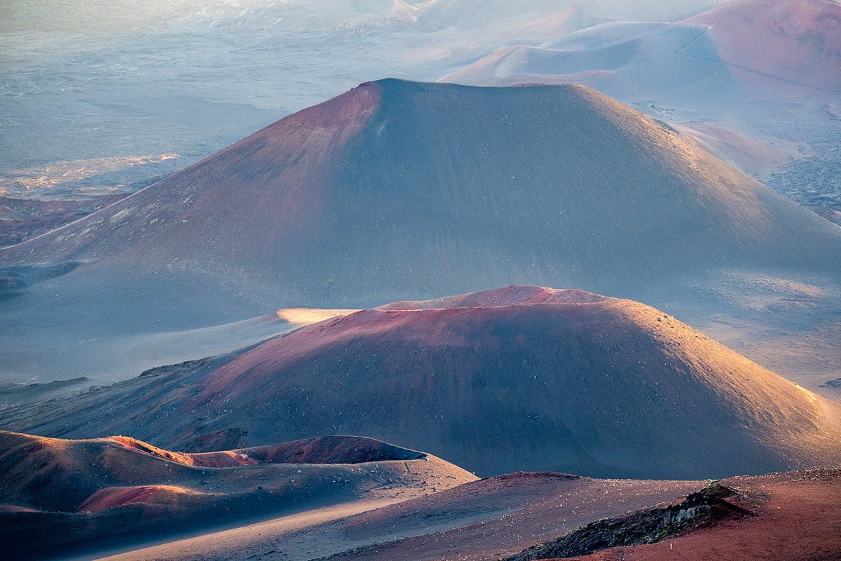 آتشفشان Haleakalā در مائوئی که دهانه بسیار بزرگی دارد و مخروط های خاکستر زیادی در اطراف آن مشاهده می شود.