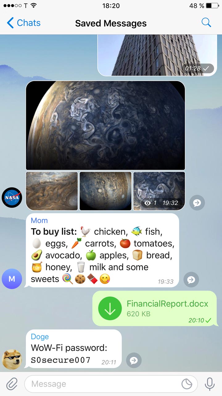 چت Saved Messages همیشه در بالای لیست صفحه تلگرام شما قرار خواهد داشت، تا پیدا کردن آن و قابلیت ذخیره کردن اطلاعات در آن آسانتر باشد.