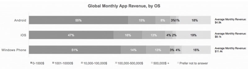 مطمئنا از این گزارش تعجب کرده اید! اما وقتی بدانید که توسعه دهندگان ویندوزفونی 50 در صد درآمد بیشتری نسبت توسعه دهندگان iOS نیز دارند بیشتر شگفت زده میشوید! با وجود این اعداد و ارقام، 86 در صد از توسعه دهندگان برای سیستم عامل اندروید، 56 در صد برای iOS و تنها 21 در صد برای پلتفرم ویندوزفون برنامه نویسی میکنند. در عین حال توسعه دهندگان ویندوزفون ماهیانه به طور میانگین مبلغی حدودا برابر با 11 هزار و چهار صد دلار به جیب میزنند. میانگین درآمد ماهیانه ی توسعه دهندگان iOS حدودا 8100 دلار و در آمد ماهیانه ی توسعه دهندگان اندرویدی نیز 4900 دلار گزارش شده است. در واقع 49 در صد توسعه دهندگان ویندوزفون در ماه بیش از 10 هزار دلار درآمد دارند در حالی که 43 در صد از توسعه دهندگان اندرویدی این مقدار درآمد ماهیانه دارند و در مورد iOS نیز 53 در صد توسعه دهندگان این پلتفرم هر ماه 10 هزار دلار درآمد کسب میکنند.