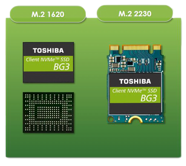 توشیبا (Toshiba) از جمله سازندگان درایو های SSD و تراشه های NAND است که محصولات آن با نام تجاری توشیبا، OCZ و تامین قطعات شرکت های دیگر، وارد بازار می گردد. توشیبا به تازگی یک خانواده جدید از درایو های SSD M.2 را با نام BG3 معرفی کرده است که ضخامت آنها تنها 1.3 بوده و در 2 فرم M.2 1620 و M.2 2230 به تولید می رسند. توشیبا از تراشه های BiCS 64-layer 3D NAND بهره گرفته و در آنها از فناوری های مدرن حافظه با عناوین HBM و TLC استفاده شده است.