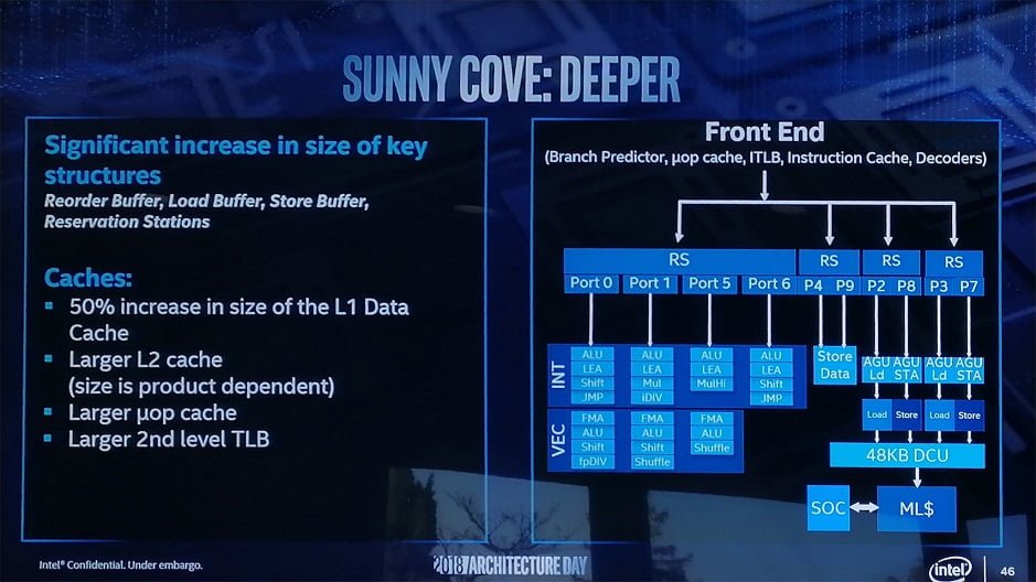 این شرکت یک ریز معماری نوین جدید با نام Sunny Cove را در دست توسعه دارد. اما اشتباه نکنید، این معماری، یک معماری مادر بوده و مانند معماری Nehalem است. در دهه گذشته، 9 معماری بر اساس این آرایه معرفی شد و اینک زمان آن رسیده است که اینتل یک معماری مادر دیگر را معرفی نماید که به گفته این شرکت، Sunny Cove نام گرفته است. برای درک بهتر، بد نیست بدانید که این معماری مادر مانند معماری AMD ZEN است که این شرکت نیز از معماری ZEN چند معماری زیرشاخه را برای تولید CPUهای خود استفاده خواهد کرد.