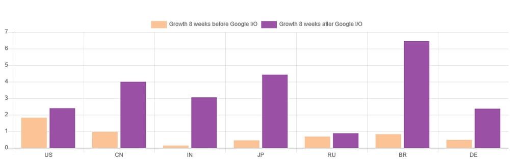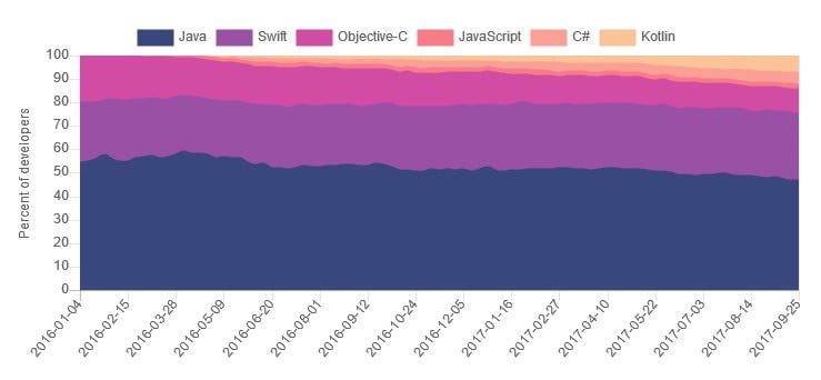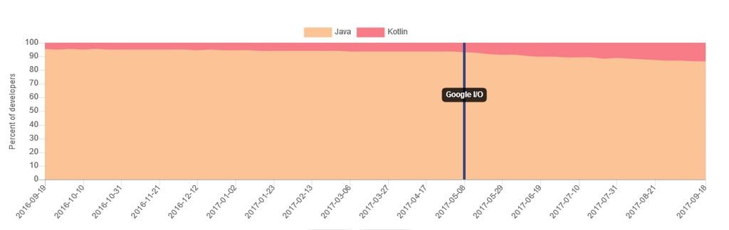 به گزارش Realm ، استفاده از Kotlin پس از معرفی آن توسط گوگل، در بین توسعه دهندگان برنامه های اندروید به شدت افزایش یافت. از زمانی که گوگل در کنفرانس I/O از Kotlin به عنوان یک زبان قابل قبول در اندروید یاد کرد، Kotlin گسترش یافت. تا پایان سال آینده این زبان، زبان جاوا را نیز بهبود خواهد بخشید و روند رو به رشدی را در برنامه های اندروید ایجاد خواهد کرد. طبق گزارش Realm، تعدادی از برنامه های ساخته شده با Kotlin از اوت 2015 به میزان 125 درصد افزایش یافته است. همچنین میزان پذیرش Kotlin در بین توسعه دهندگان از 7.4 درصد به 14.7 درصد رسیده و در واقع پس از اعلام گوگل دو برابر شده است. علاوه بر این، تعداد برنامه های اندروید ساخته شده با جاوا در طی چهار ماه گذشته 6.1 درصد کاهش داشته است. پیش بینی می شود که Kotlin تا ماه دسامبر سال آینده 51 درصد سهم بازار را بدست آورد و از Java برای توسعه اندروید پیشی بگیرد.
