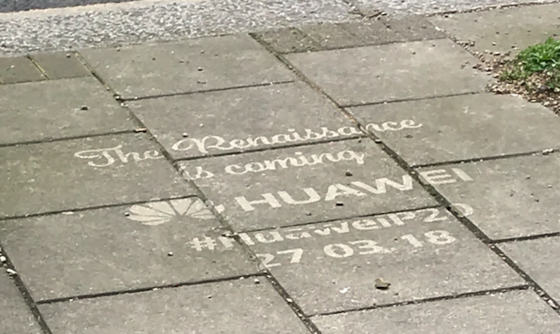 کامیون های تبلیغاتی تنها حرکت هواوی در این راستا نبوده است. چند طرح گرافیتی هم در مقابل فروشگاه های این دو شرکت بر روی زمین نقاشی شده اند که نشان میدهد “Renaissance” در حال آمدن است. احتمالاً این انقلاب رنسانسی به دوربین های P20 ها و حالت های ویژه عکاسی این گوشی ها اشاره دارد.