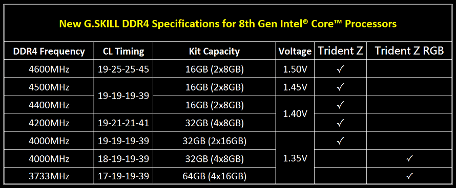 همزمان با معرفی پردازنده نسل هشتم اینتل موسوم به کافی لیک، برندهای تولید کننده سخت افزار نیز محصولات سازگار با این پردازنده ها را رونمایی کرده اند. از جمله آنها برند جی اسکیل (G.Skill) است که سری جدید رم های Trident Z RGB را بر اساس این محصولات برنامه ریزی و معرفی کرده است. این ماژول ها در کیت های 16، 32 و 64 گیگابایتی تولید شده اند که ولتاژ راه انداز آنها نیز 1.35، 1.40، 1.45 و 1.50 ولت است. همچنان شاهد استفاده از تراشه های Samsung B-die DDR4 در ساختار آنها هستیم.