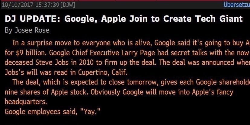 طبق این خبر لری پیج، مدیرعامل گوگل در سال 2010 با استیو جابر قراری گذاشته اند که گوگل، اپل را به قیمت 9 میلیارد دلار خریداری کند. پس از این معامله نیز گوگل به دفتر مرکز اپل نقل مکان خواهد کرد. باوجود اینکه واضح بود این خبر جعلی است، اما سهام گوگل افزایش یافت به 158 دلار رسید، اما کمی بعد در 155.84 دلار ثابت شد.