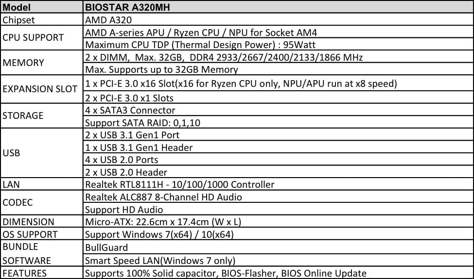 هدایت شبکه در این مدل بر عهده کنترلر Realtek RTL8111G بوده و یک اسلات PCI-E 3.0 x16 به همراه دو اسلات توسعه PCI-E 1.0 x16 برای آن در نظر گرفته شده است. BIOSTAR A320MH برای ویندوز های 7 و 10 بهینه گشته و خروجی HDMI به کار رفته در آن از دقت 4K نیز پشتیبانی خواهد کرد. مدارهای حفاظتی OC, OV, OT، فناوری Smart Speed LAN، سیستم صوتی 7.1 کاناله و استفاده از ماسفت های Low RdsOn P-Pak، از جمله دیگر امکانات به کار رفته در مادربرد مادربرد BIOSTAR A320MH به شمار می روند.