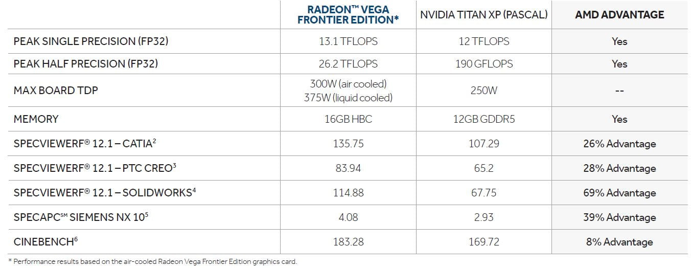 اطلاعات مورد بحث را مجموعه EXXACT منتشر کرده است. کارت گرافیکی که از کولر مایع (Water Cooler) بهره می برد با توان حرارتی 375 وات و کارت گرافیک با کولر بادی (Air Cooler) نیز با توان حرارتی 300 وات راهی بازار خواهد شد. این کارت گرافیک با کارت گرافیک NVIDIA TITAN Xp مقایسه شده است؛ این مقایسه از سوی AMD صورت گرفته و منتشر شده است. NVIDIA TITAN Xp به عنوان قدرتمند ترین تراشه گرافیکی-گیمینگ جهان شناخته می شود که البته در کلاس ایستگاه کاری و نه سرور استفاده می شود. NVIDIA TITAN Xp دارای 12 گیگابایت حافظه گرافیکی از نوع GDDR5X است که EXXACT به اشتباه و یا از روی قصد، در جدول مقایسه تراشه های حافظه رقیب (انویدیا) را GDDR5 درج کرده است. کارت گرافیک AMD Radeon Pro Vega Frontier Edition از 16 گیگابایت حافظه از نوع HBM2 بهره می برد.