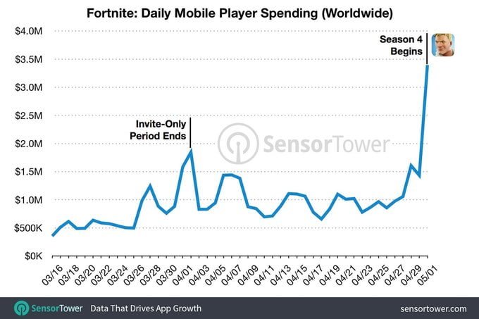 Epic کمپانی توسعه دهنده بازی فورت نایت سیاست خوبی در پیش گرفته است و فصل های درون بازی، بازیکنان را سرگرم کرده است. شرکت در نبردهای فصلی که در درون بازی وجود دارد 950 V-Bucks هزینه دارد که این مبلغ کمتر از 10 دلار برای بازیکنان هزینه در پی خواهد داشت. شرکت در این فصل ها به بازیکنان آیتم های اضافی میدهد که به آنها امکان این را میدهد که آخرین فصل را کامل کرده و در نهایت میزان پول خود در بازی را افزایش دهید. فصل جدید این بازی اوایل هفته منتشر شد و درآمد بازی را تا 293 درصد افزایش داد.