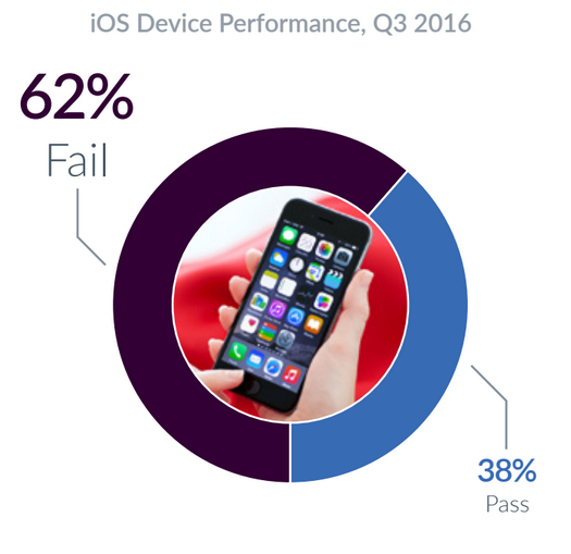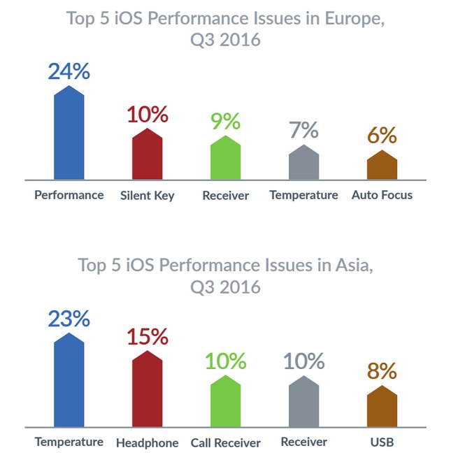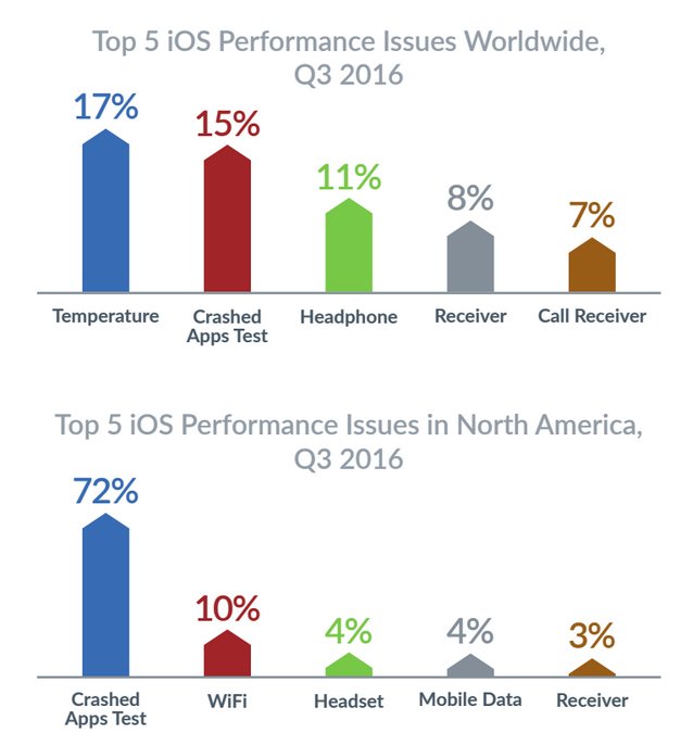 در جدیدترین گزارشی که توسط گروه فناوری Blannco منتشر شده است، در سه ماهه ی سوم سال جاری 62 در صد از گوشی های آیفون و تبلت های آیپد دچار مشکلات مختلف شده اند. این در حالیست که 47 در صد از دستگاه های اندرویدی دچار مشکلات مشابه شده اند. اپلیکیشن ها بر روی 65 در صد از دستگاه های مجهز به iOS کرش کرده اند و در سمت دیگر تنها 25 در صد از نرم افزار ها بر روی گجت های اندرویدی دچار مشکل شده اند. این گزارش حاکی از این دارد که آیفون 6 اپل با سهم 13 در صد بالاترین مشکلات نرم افزاری را تجربه کرده است. در ادامه آیفون 6اس 9 در صد، آیفون 5اس 9 در صد و آیپد ایر 2، دو در صد دچار کرش های نرم افزاری شده اند. در این گزارش، مقصر افزایش نرخ کرش در دستگاه های iOS بروزرسانی نسخه ی 10 این سیستم عامل شناخته شده است.