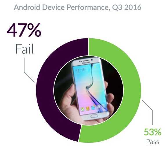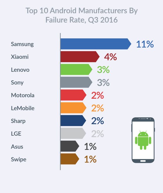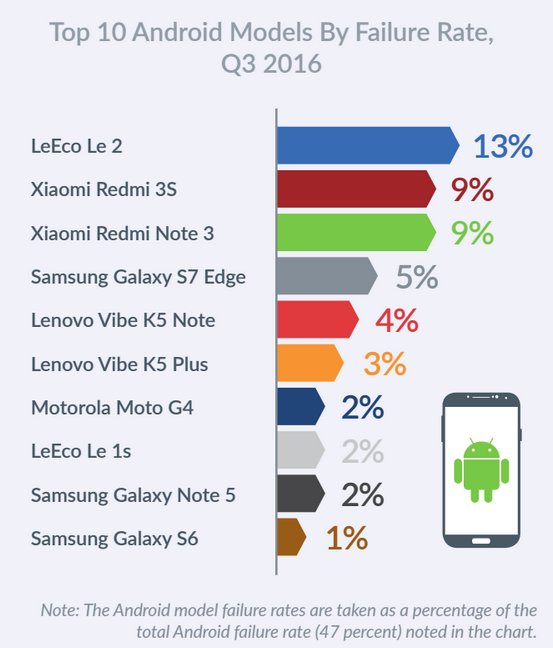 اما در میان گجت های اندرویدی، گوشی هوشمند LeEco Le 2 با سهم 13 در صد بیشتر از هر گجت اندرویدی دچار کرش شده است. دو گوشی هوشمند از شیائومی مدل های ردمی 3اس و ردمی 3 نوت نیز 9 در صد از میزان کرش در گوشی های اندرویدی را به خود اختصاص داده اند. گلکسی اس 7 اج سامسونگ با سهم 5 در صد و لنوو Vibe K5 نیز با سهم 4 در صد در رده ی چهارم و پنجم جدول پر مشکل ترین گجت های اندرویدی قرار گرفته اند. بیشترین مشکل در بین گجت های اندرویدی مربوط به باتری این دستگاه ها بوده است و سپس بخش صفحه نمایش بیشتر دچار مشکل شده است. گجت های اندرویدی تولید شده توسط سامسونگ با سهم 11 در صد بیشتر از دیگر برند ها دچار نقض فنی شده اند و سپس شیائومی با سهم 4 در صد در رده ی دوم قرار دارد. در اینجا باید میزان فروش برند ها و تنوع دستگاه ها نیز در نظر گرفته شود. کرش اپلیکیشن ها در دستگاه های مجهز به iOS در امریکای شمالی بیشتر از هر نقطه ی دیگری از دنیا رخ داده است. در سراسر جهان، افزایش دما بزرگترین مشکل در بین گجت های ساخت اپل بوده است. کاربران اندرویدی مقیم آمریکای شمالی نیز با کرش نرم افزار ها بیش از هر مشکل دیگری دست و پنجه نرم کرده اند.
