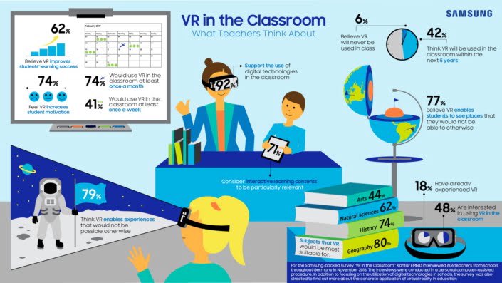 آلمان فناوری های دیجیتالی را در سطح کاملاً جدیدی وارد آموزش و پرورش کرد و درهای جدیدی از علم را به روی معلمان و دانش آموزان باز کرد. بخش الکترونیکی سامسونگ آلمان تصمیم گرفت تا با استفاده از تکنولوژی برای فردایی بهتر، تغییری در شکل آموزش و پرورش ایجاد کند. بررسی های اخیر انجام شده توسط Kantar EMNID که یک شرکت تحقیقاتی آلمانی است؛ از 606 معلم در سراسر آلمان درخواست کرده تا به کمک تکنولوژی های جدید و واقعیت مجازی(VR)، شیوه ی تدریس را در کلاس های درس ارتقا دهند. طی یک نظرسنجی مشخص شد که 92 درصد از معلمان با استفاده ی تکنولوژی واقعیت مجازی در آموزش موافقند. طبق این بررسی، معلمان هنگام تدریس از کامپیوتر،لپ تاپ و پروژکتور استفاده میکنند و اکثر این معلمان هیچ مشکلی در یادگیری و کار کردن با تکنولوژی های جدید ندارند. علاوه بر اینها علاقه ی زیادی به استفاده از واقعیت مجازی نشان داده شده است. اما فقط 18 درصد از متقاضیان به صورت حرفه ای قادر به استفاده از واقعیت مجازی هستند و این تکنولوژی فقط در 4 درصد مدارس موجود است. با این حال 48 درصد معلمان علاقمند به داشتن این تکنولوژی در کلاسهایشان هستند ضمن اینکه در معلمان زیر 30 سال این آمار به 58 درصد میرسد. همینطور که از آمار و ارقام مشخص است؛ معلمان در زمینه ی اجرای شیوه های جدید آموزشی بسیار روشنفکر هستند و همچنین پتانسیل زیادی در یادگیری تکنولوژی و واقعیت مجازی دارند بنابراین موضوع فعلی روی بالا بردن توانایی معلمان است.