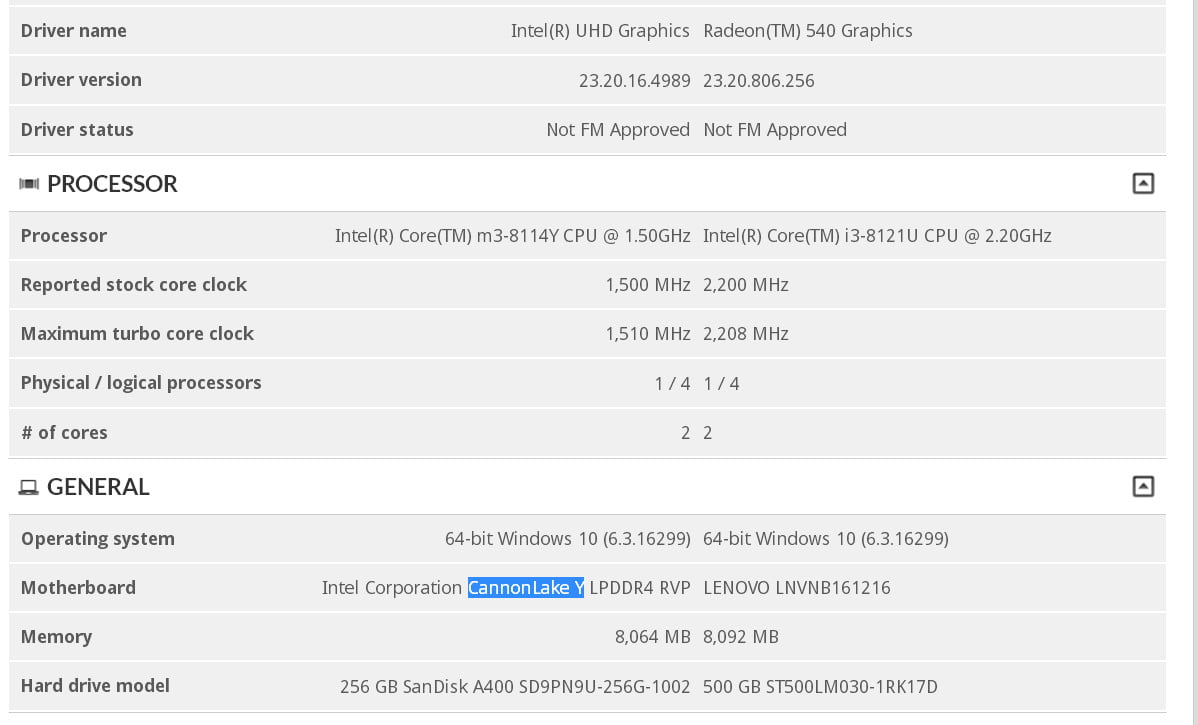 با وجود آنکه اینتل تائید کرده بود که بخش عمده CPU های 10 نانومتری خود را در اوایل سال 2019 راهی بازار می کند، اما پس از انتشار مشخصات Intel Core i3-8121 از خانواده Cannon Lake، اینک دومین پردازنده این گروه نیز سر از یک پایگاه داده درآورده است. این اطلاعات به یک پردازنده موسوم به Intel Core M3 8114Y تعلق دارد که این گونه نیز از خانواده Cannon Lake-Y است.