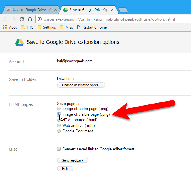 در بخش HTML pages شما میتوانید انتخاب کنید که صفحه وبتان چگونه در گوگل درایوتان ذخیره شود. این صفحات را میتوانید به صورت عکس از کل صفحه، عکس از قسمتی که در حال مشاهده آن هستید، به صورت صفحه HTML و web archive یعنی با فرمت mht. یا به صورت Google Document در گوگل درایو خود ذخیره کنید.