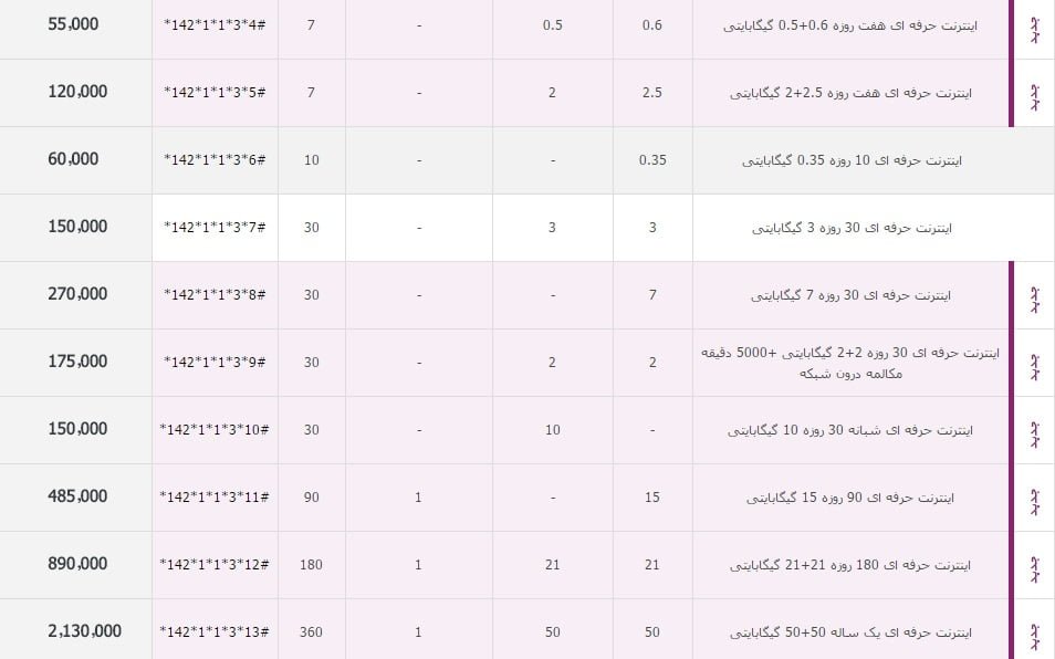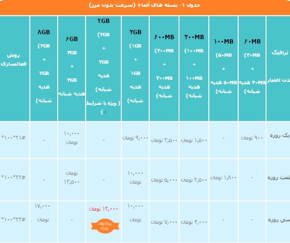 همچنین اگر جزو آن دسته از کاربران هستید که عمده مصرف اینترنت شما بین ساعت های 2 تا 7 صبح است می توانید از بسته یک ماهه آلفا + شبانه با حجم 22 گیگابایت و قیمت 9000 تومان استفاده کنید. فعال سازی این طرح با استفاده از کد دستوری #273*100* می باشد.