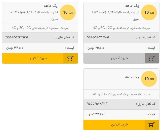 بسته های ایرانسل تنوع بیشتری نسبت به اپراتور اول دارند. ایرانسل برای کاربران خود طرح های سالانه، شش ماهه، یک ماهه، هفتگی، روزانه و حتی ساعتی در نظر گرفته تا هر کاربری بتواند با توجه به نیاز خود از این بسته ها استفاده کند. البته باید این نکته را هم در نظر داشته باشید که قیمت بسته های ساعتی و روزانه به مراتب گران تر از بسته های مدت دار است و به همین دلیل اگر کاربر ثابت اینترنت هستید بهتر است دور بسته های ساعتی یا روزانه را خط بکشید. به علاوه ایرانسل طرح های عجیب و غریب دیگری هم دارد. بسته هایی مانند 5 گیگابایت هفتگی برای ساعت های 6 صبح تا 12 ظهر به قیمت 2000 تومان یا 6 گیگابایت هفتگی به صورت 2 گیگابایت روزانه و 4 گیگابایت شبانه با قیمت 10000 تومان که ظاهرا هر یک برای گروه خاصی از کاربران در نظر گرفته شده است. اما بازهم بهترین بسته ایرانسل که هم قیمت زیادی نداشته باشد و هم مدت کوتاهی کار نکند، بسته یک ماهه این اپراتور با حجم 10 گیگابایت، بدون محدودیت سرعت و بدون محدودیت زمان است که با قیمت 32500 تومان به فروش می رسد و با استفاده از کد #3*8*5*555* می توانید آن را فعال کنید.