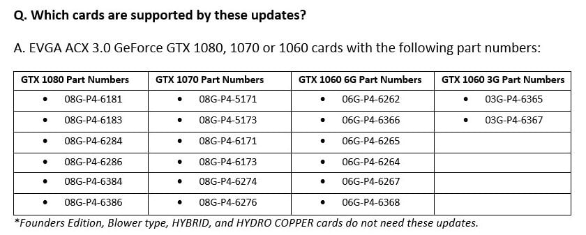 در ادامه یک لیست از کارت گرافیک های مورد بحث منتشر شده است که دارندگان آنها هم اینک قادر به دریافت این فایل هستند. اما توصیه ما به شما، استفاده ی همزمان از پد اضافی حرارتی و بروزرسانی بایوس به طور همزمان است. امید آن می رود که این برند خوش نام به طور کلی ایراد مورد نظر را برطرف سازد.