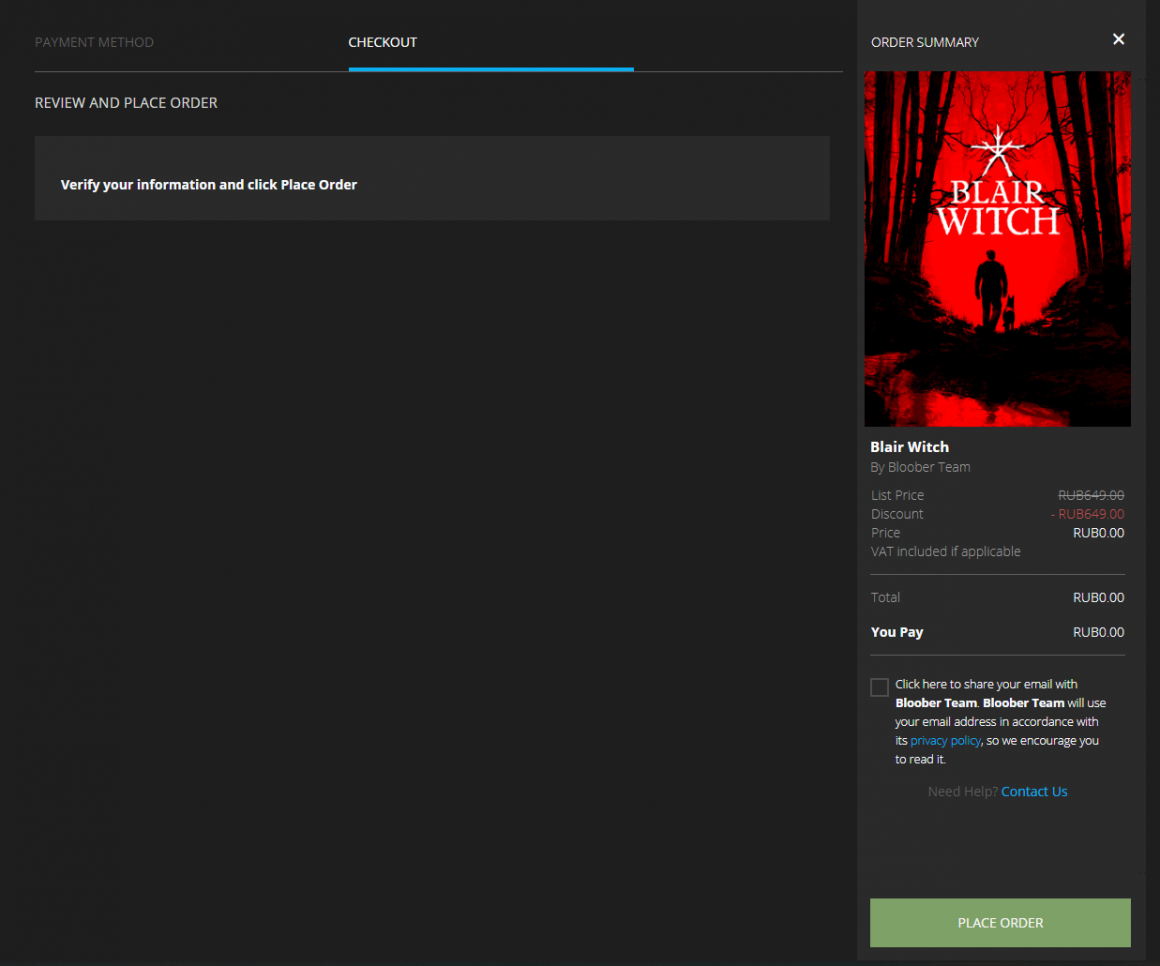 برای دانلود این بازی بعد ورود به بخش Store در لانچر Epicgames کافیست در بخش Free Games به دنبال بازی Blair Witch بگردید. پس از ورود به صفحه این بازی و قبول شرایط قوانین سن، تنها کافیست بر روی Get کلیک کنید. پس از انجام اینکار در صفحه پرداخت بر روی Place Order که با رنگ سبز نمایش داده شده است کلیک کنید تا پیام Thank You به شما نمایش داده شود. سپس گزینه Get به شکل Owned در خواهد آمد و شما دارای نسخه اورجینال این بازی خواهید شد.