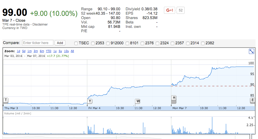 در طول خرید و فروش های انجام شده در روزهای یکشنبه و دوشنبه ارزش سهام اچ تی سی نزدیک به 21 در صد افزایش یافته است و با این وجود اچ تی سی کمترین درآمد ماهیانه را در دوران اخیر خود ثبت کرد. روز یکشنبه سهام اچ تی سی 9.75 در صد افزایش یافت و در روز دوشنبه نیز ارزش سهام تنها در چند ساعت تا 10 در صد افزایش پیدا کرد که این کمپانی را مجبور کرد که در آن روز مبادلات خود را تعطیل کند . هر سهم اچ تی سی در بازار بورس اکنون حدودا 99 دلار تایوان ارزش دارد که بالاترین قیمت از ماه ژوئن 2015 تا کنون به حساب میآید.