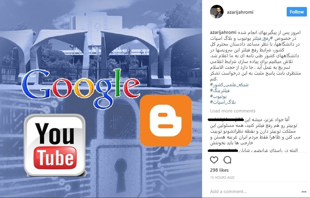 امروز پس از پیگیری های انجام شده در خصوص رفع فیلتر یوتیوب و بلاگ اسپات در دانشگاهها، با نظر مساعد دادستان محترم کل کشور، شرایط رفع فیلتر این سرویسها در دانشگاههای کشور طی نامه ای به ما اعلام شد. تلاش میکنیم برای پیاده سازی شرایط اعلامی تسریع به عمل آید.