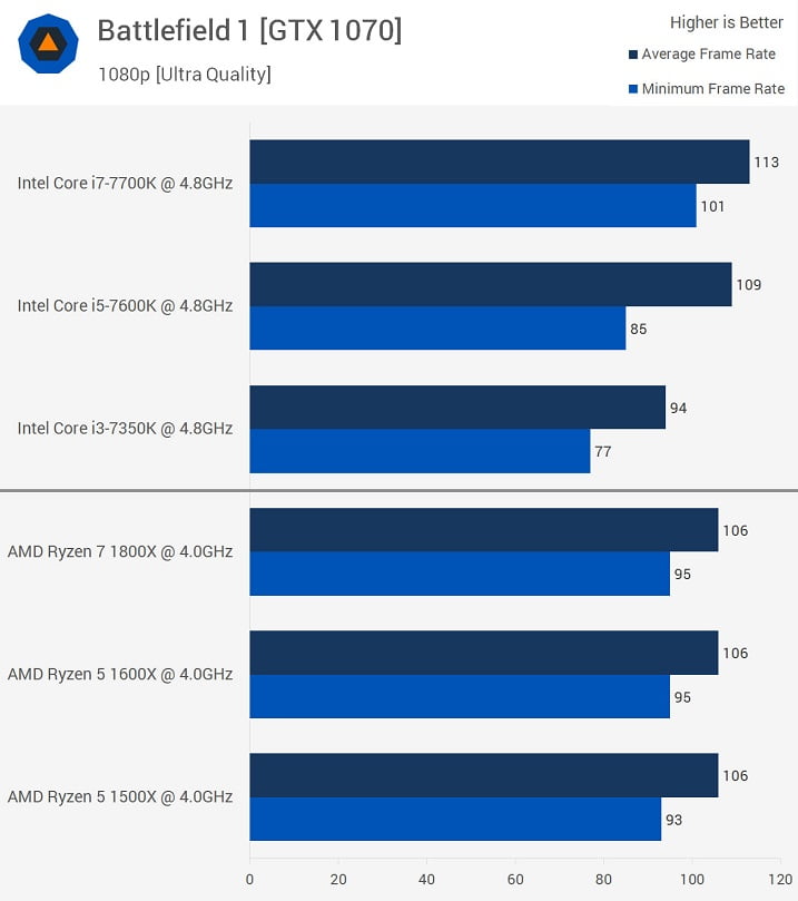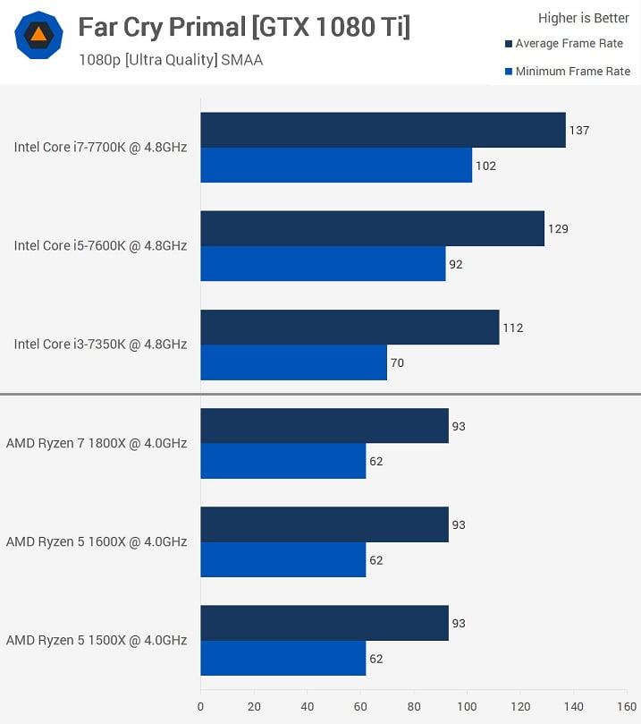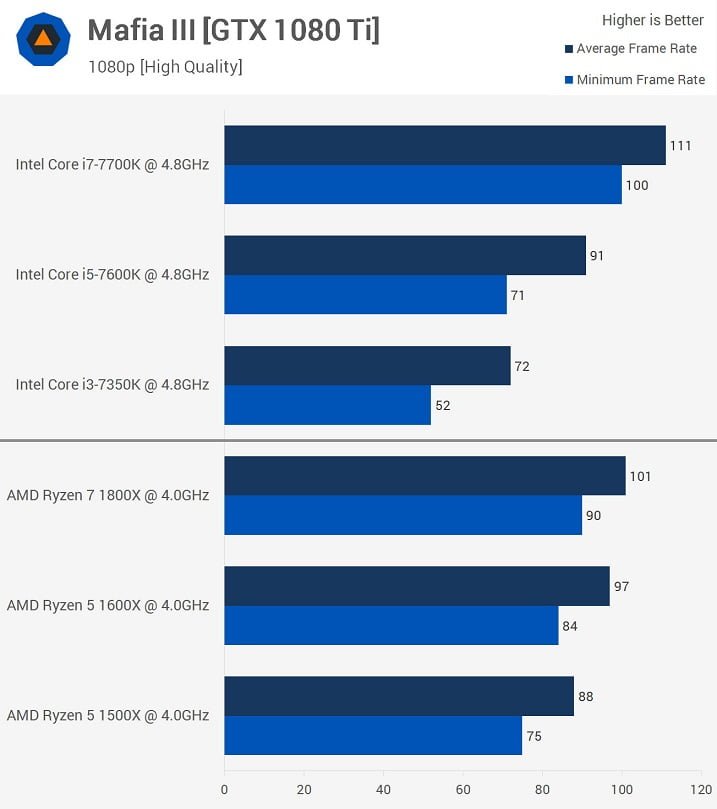 در این اقدام پردازنده های  Ryzen 5 1600X و 1500X شبیه سازی شده اند. در این حالت (CCX (quad-core complex در پردازند Ryzen 7 1800X غیر فعال شده است و جالب است بدانید که نرم افزار Ryzen Master به کاربران این امکان را می دهد که 2، 4 و 6 هسته از پردازنده را غیر فعال نمایند؛ اما هسته های خاصی برای این منظور در نظر گرفته نشده اند و به طور اتفاقی می تواند هر هسته خاموش گردد. مسئله بعدی حافظه کش سطح L3 است که به 8 مگابایت کاهش یافته است. نکته جالب توجه در این آزمون این است که دقت آن چندان قابل تائید نبوده و این مسئله به دلیل برخی مسائل در سطح CCX و حافظه نهان است؛ با این وجود این نتایج می توانند دلگرم کننده باشند. شایان ذکر است که در این آزمون سیستم تست از کارت گرافیک GeForce GTX 1080 Ti برخوردار است. در بالای اسلاید ها رزولوشن و نام بازی ها درج شده است. پردازنده هایی مانند Intel Core i7-7700K و دو هسته ای معروف i3-7350K در این آزمون در برابر شبیه سازی های AMD قرار گرفته اند. در ادامه می توانید شاهد تصاویر باشید.
