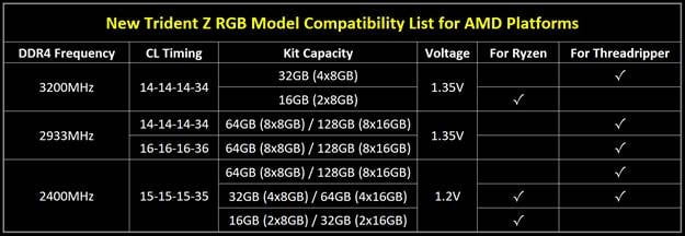 جی اسکیل (G.skill) خانواده ی جدیدی از رم های DDR4 را به لیست QVL پردازنده های AMD افزوده است؛ رم های Trident Z RGB جدید به طور خاص برای پلتفرم های جدید AMD شامل Ryzen و Threadripper بهینه سازی شده اند و در 3 فرکانس متفاوت شامل 2400 مگاهرتز، 2933 مگاهرتز و 3200 راهی بازار خواهند شد. این کیت ها در آرایش 2 و 4 کاناله عرضه می شوند که شامل 2 الی 8 ماژول هستند. پشتیبانی از پروفایل OC در بایوس مادربردهای AMD نیز برای آنها در نظر گرفته شده است.