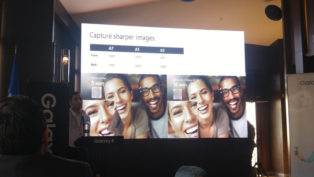 امروزه سمت و سوی استفاده از دوربین گوشی های هوشمند بطرف دوربین های جلو به دلیل محبوبیت عکس های سلفی است.به همین دلیل سامسونگ از سنسورهای 16 مگاپیکسلی در دوربین جلو گلکسی A2017 استفاده کرده است البته این استثنا برای A3 وجود دارد که در آن از دوربین جلو (سلفی)8 مگاپیکسل و دوربین اصلی(عقب) 13 مگاپیکسل استفاده شده است.استفاده از رابط کاربری ساده برای دوربین،استفاده از 16 فیلتر پیش فرض، تبدیل شدن صفحه نمایش سوپرآمولد گوشی به فلاش در زمانی که نور محیط برای گرفتن سلفی کم است از دیگر ویژگیهای اضافه شده است.از جمله امکانات دیگر استفاده از دکمه شاتر شناور است که برای اولین بار در این گوشی استفاده شده و امکان قرار دادن آن را در هر نقطه از صفحه نمایش به ما می دهد تا بتوانیم با کمترین لرزش عکس دلخواه خود را ثبت کنیم.
