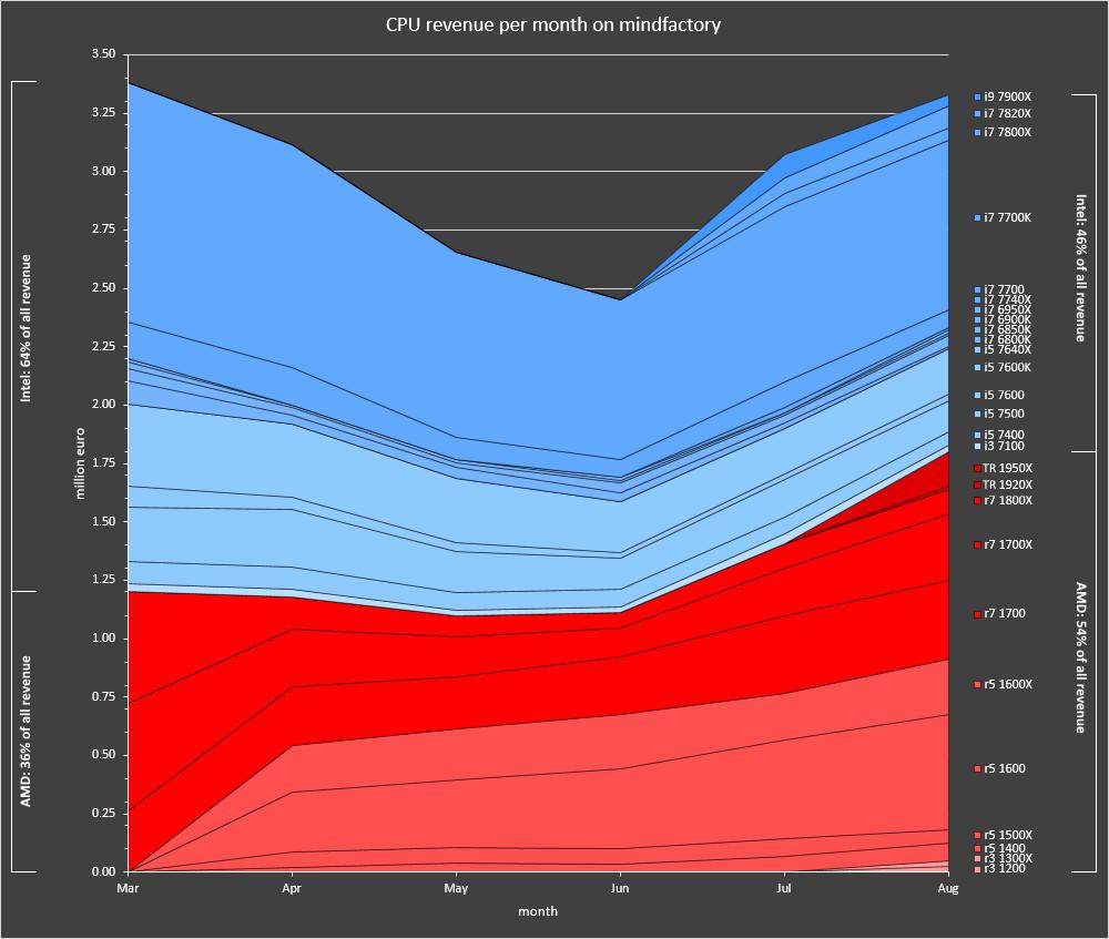 در روز های اخیر، برخی اطلاعات از پردازنده های AMD Ryzen حاکی از آن بود که فروش این محصولات در بازار آلمان بسیار چشمگیر گشته و حتی در برخی مناطق از رقیب خود، اینتل، جلو زده است. بزرگترین فروشگاه این کشور اعلام کرده است که پس از سالهای طولانی، در نهایت AMD موفق به کسب سهم مناسبی از بازار پردازنده در این کشور شده است؛ پردازنده های Ryzen از ماه مارس 2017 تا کنون، رشدی نسبی اما مداوم را تجربه کرده اند.