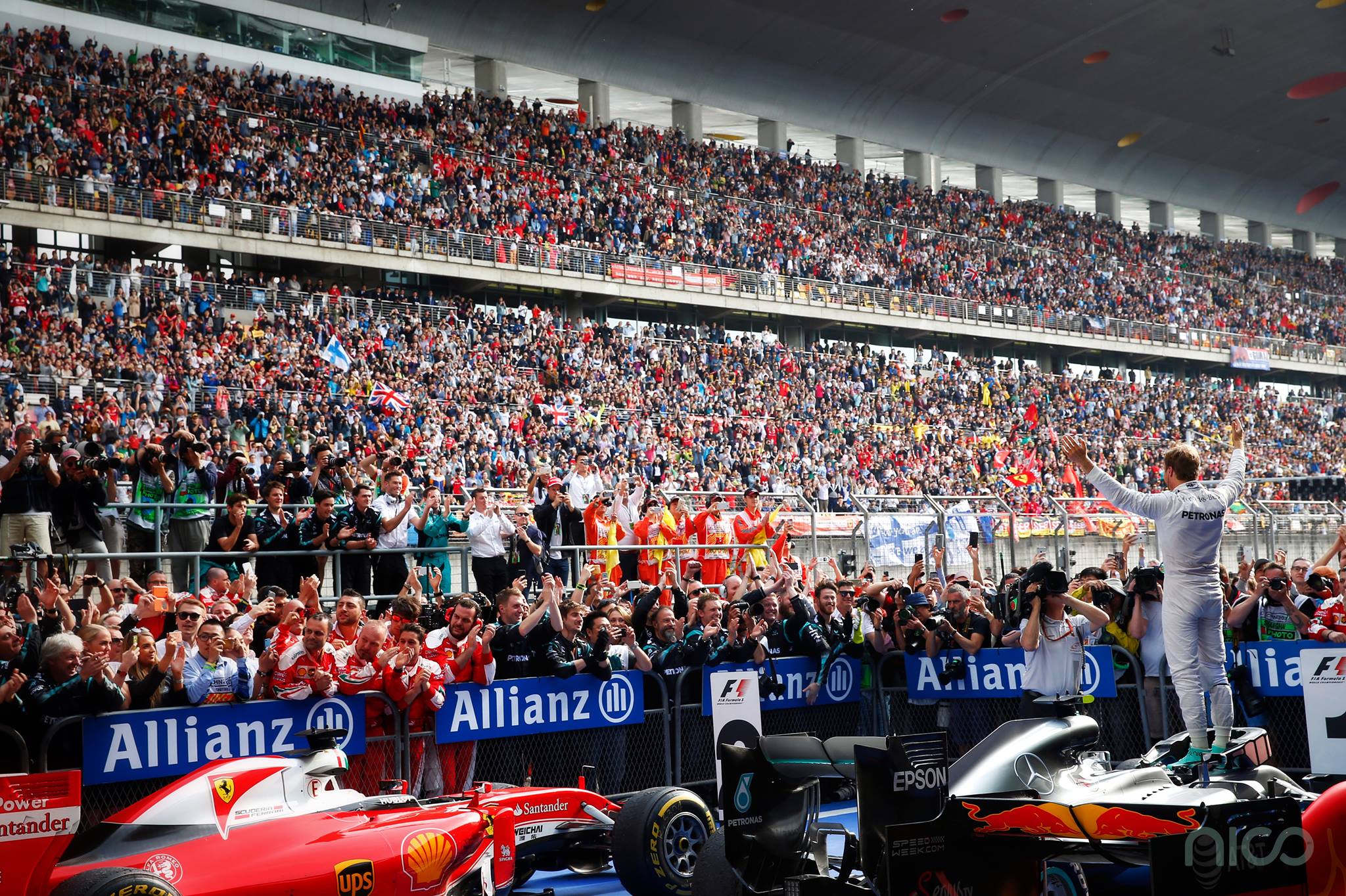 29 فروردین ماه مسابقه سوم فصل در شانگهای چین برگزار شد و بدشانسی های مدافع عنوان قهرمانی به چین هم کشیده شد! همیلتون که به دلیل تغییر جعبه دنده پنج رده پنالتی دریافت کرده بود بدلیل مشکلات فنی نتوانست در زمانگیری شرکت کند و در روز مسابقه نیز بدشانسی های او ادامه پیدا کرد و تصادف دو فراری با هم منجر به برخورد فیلیپه نصر (Felipe Nasr) برزیلی از تیم سائوبر با خودروی همیلتون شد و آسیبی که به خودروی وی وارد شد رقابت برای سکو را از او گرفت. اما نیکو رزبرگ با رانندگی خوب و کمی خوش شانسی سومین مسابقه فصل جدید را نیز با پیروزی پشت سر گذاشت و دنیل ریکیاردو و سباستین فتل مسابقه را در رده های دوم و سوم به پایان رساندند. مسابقه چین اولین قدم از شروع دردسر ها برای دنیل کویات (Daniil Kvyat) راننده روس تبار تیم ردبول بود که در ابتدای این مسابقه باعث تصادف فراری ها شده بود.