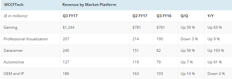 درآمد انویدیا در 3 ماهه دوم سال 2016 به 1.43 میلیارد دلار رسید که در آن زمان تاثیر کارت گرافیک های “پاسکال” به طور کامل بر روی آن قرار نگرفته بود. درآمد غول سبز تراشه در جدید ترین گزارش مالی خود به 2.0 میلیارد دلار رسیده است. این در حالی است که درآمد این کمپانی در مدت زمان مشابه در سال گذشته به 1.30 میلیارد دلار رسیده بود و باید گفت که این شرکت رکورد درآمد خود را به لطف فروش بی سابقه ی کارت گرافیک های GTX1000 شکسته است. رشد درآمد این کمپانی به بیش از 54% درصد رسیده است. هر چند که انویدیا در حوزه های بسیار متفاوت و متعددی فعالیت دارد، اما عمده درآمد آن همچنان از بخش تامین سخت افزار و تراشه های گیمینگ است.