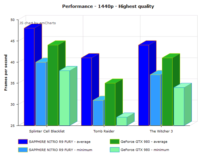 کولر انحصاری این کمپانی تحت عنوان Tri-X cooler وظیفه دفع حرارت از GPU و سیلیکون های حافظه را بر عهده خواهد داشت.تمرکز اصلی این کولر بر روی GPU است و تراکم سینک در قسمت های حافظه مقداری کمتر می گردد و در نهایت 3 قن 90 میلی متری بر روی آن قرار گرفته است.نسل دوم فناوری سافایر تحت عنوان IFC II نیز به منظور مدیریت سیستم خنک کننده به خدمت گرفته شده است.بدین ترتیب نه فقط سرعت فن ها،بلکه کنترل و مدیریت فن ها به صورت تکی امکان پذیر است و این سامانه با توجه به دمای موجود در پردازنده عمل خنک سازی را در بخش های مختلف انجام می دهد.و اما نکته دیگر تست های انجام شده توسط این کارت گرافیک و رقیب اش Nvidia GTX980 است.در نمودار زیر می توانید نتایج این مقایسه ها را تماشا کنید.این مقایسه در دقت 1440P صورت گرفته است.