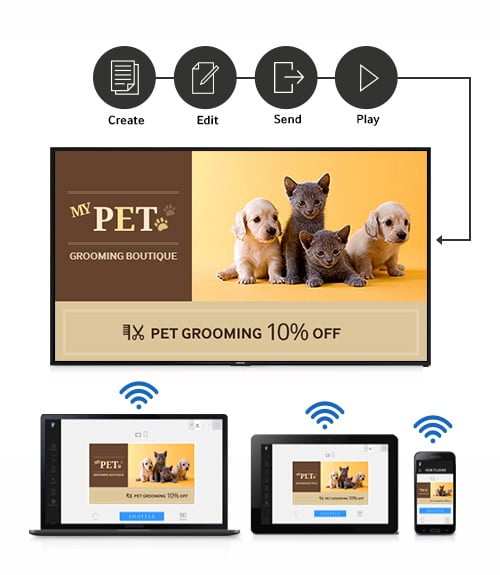 این تلویزیونهای تجاری به راحتی و بدون نیاز به تکنسین، نصب و مدیریت میشود. تنها کافی است دارای سطح متوسطی از دانش عمومی کامپیوتر و تکنولوژیهای روز باشید تا بتوانید از طریق موبایل، تبلت یا لپتاپ، محتوای موردنظرتان را تولید کنید. درواقع در فرآیند نصب، تنها به یک دستگاه (Samsung Smart Signage TV) که قابل اتصال به Wifi نیز هست، یک دستگاه تولید محتوا مثل موبایل و یک نرمافزار تولید محتوا نیاز دارید.
