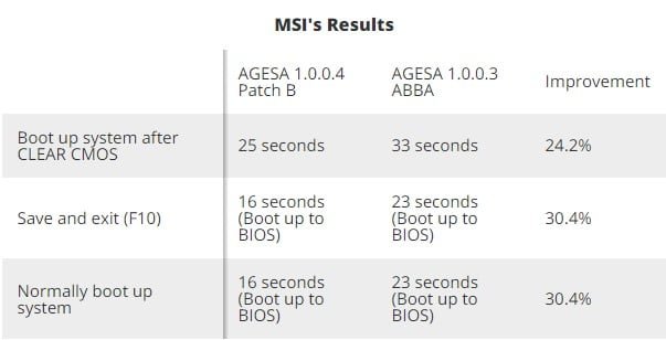 از آنجایی که بوت شدن سیستم به محیط ویندوز به عوامل مختلفی بستگی دارد، MSI مقیاس سنجش خود در تست ها را مدت زمان ورود به محیط بایوس مادربرد قرار داده است. بر روی میکروکد AGESA 1.0.0.3، زمان بوت 22 ثانیه ای به ثبت رسیده در حالی که سیستم مشابه با میکروکد نسخه 1.0.0.4 زمان بوت به 16 ثانیه کاهش پیدا کرده و 22.7 درصد بهبود یافته است.