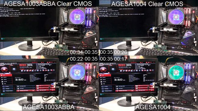 این تست بعد از پاک کردن CMOS مادربرد نیز صورت گرفته که در این حالت، مادربرد X570 MEG Godlike با سفت افزار AGESA 1.0.0.3 زمانی معادل 34 ثانیه برای بوت لازم داشته که بعد از استفاده از AGESA 1.0.0.4 این مقدار با کاهش 23.5 درصدی، به 26 ثانیه میرسد. این سفت افزار جدید هم اکنون برای مادربردهای چیپست X570 شرکت MSI در دسترس است و مادربردهای سری 400 MAX نیز تا اواسط نوامبر و مادربردهای سری 300 و 400 تا پایان ماه نوامبر این سفت افزار را دریافت خواهند کرد.