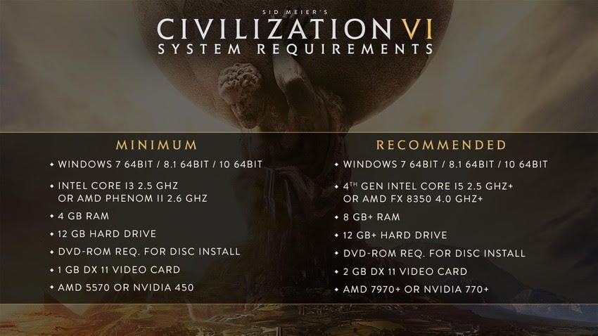 شرکت تو کی گیمز (2k games) سیستم مورد نیاز برای اجرای بازی Civilization VI (تمدن 6) را برای کامپیوتر مشخص کرد. حداقل سیستم مورد نیاز این بازی نسبت به سایر بازی ها بسیار سبک بوده و برای اجرای آن نیازمند آنچنان سیستم قدرتمندی نمی باشد . با سخت افزار همراه باشید.