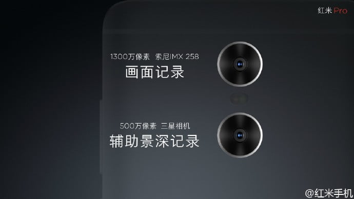 به بخش دوربین ردمی پرو میرسیم جایی که همان طور که انتظار میرفت این گوشی به دوربین دوگانه مجهز شده است. سنسور اصلی دوربین این گوشی را یک لنز 13 مگاپیکسلی ساخت سونی از نوع IMX258 تشکیل میدهد در حالی که در پائین این لنز، سنسور 5 مگاپیکسلی ساخت سامسونگ جای گرفته است. رنج گشادگی دیافراگم دوربین ردمی پرو بین f/.095 تا f/5.6 گزارش شده است. امکان تغییر نقطه ی فوکوس نیز پس از ثبت تصویر در نرم افزار دوربین این گوشی وجود دارد. ضمن اینکه در جلوی دستگاه نیز لنز 5 مگاپیکسلی با پوشش زاویه ی 85 درجه ای قرار گرفته است.