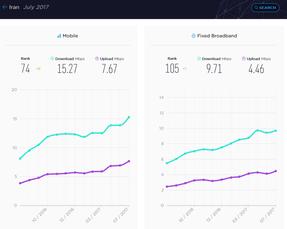 اما ایران در رده بندی سرعت اینترنت موبایل با سرعت دانلود 15.27 Mbps در رده هفتاد و چهارم جهان قرار گرفته است. شاید این رتبه چندان جالب به نظر نرسد اما اگر به آمارهای منتشر شده در سال های گذشته و رتبه های بیشتر از 150 ایران در بین کشورهای جهان توجه داشته باشیم متوجه تغییرات گسترده ای خواهیم شد که در طول سال های اخیر صورت گرفته اند. البته این پیشرفت نباید مانع از برآورده سازی تقاضای کاربران برای عادلانه شدن قیمت گذاری اینترنت و سرعت سرویس های ارائه شده گردد.