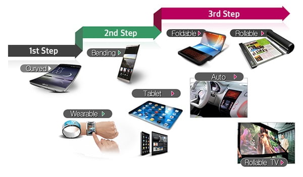 ال جی در نظر دارد تا از این محصول جدید نه فقط در تلفن های هوشمند بلکه در تبلت ها ، ابزار های پوشیدنی ، مانیتور های PC ، تلویزیون ها ، داشبورد خودرو ها و حتی در طراحی های داخلی استفاده کند. این شرکت وعده داده تا در سال 2017 ابزار های تاشو همراه را تولید کند ولی این موضوع کمی خوش بینانه است چون باید ابتدا قطعات تاشو دیگری مثل تراشه ها ، بردها ، رم ها و غیره هم در صنعت تولید شوند تا این آرزو به واقعیت تبدیل شود. مگر اینکه قطعات سخت افزاری در گوشه ای از دستگاه قرار بگیرند و فقط صفحه نمایش و فضای اطراف آن قابلیت خم شدن و تاشودن را داشته باشند. ال جی اعلام کرده تولید انبوه این صفحه نمایش های جدید را از ماه جولای سال جاری میلادی آغاز می کند اما معلوم نیست ابتدا در کدام محصول ال جی ( شاید LG G4 یا G5 و یا با احتمال بیشتر در LG G Flex 3)، مورد استفاده قرار گیرد.