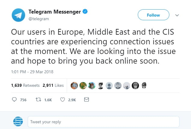 تلگرام امروز برای ساعاتی است که دچار اختلال شده و سرعت آن به شدت کند شده است. تعدادی از کاربران گزارش داده اند، به طور کلی در اینترنت خانگی و موبایل پیام رسان تلگرام آنها از دسترس خارج شده است. به نظر میرسد که این مشکل مربوط به داخل کشور نمی باشد، چرا که تلگرام در حساب توئیتر خود در این رابطه گفته است:
