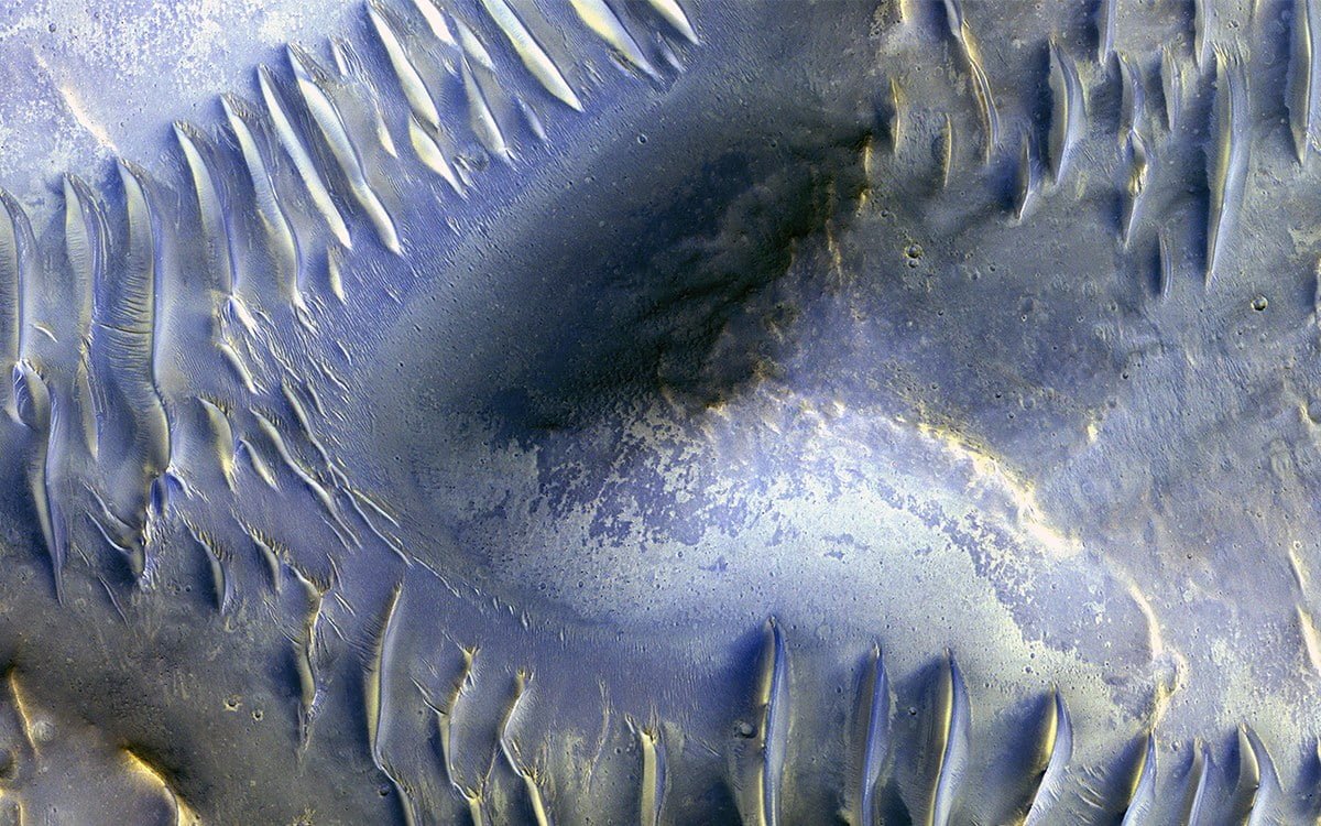این گروه از تپه های شنی در نزدیکی گودالی در مرکز یک دهانه برخوردی به گسترده 22 مایل، در مریخ واقع شده است. تپه های کوچکتری که عمود بر تپه های بزرگتر هستند به احتمال زیاد نشان دهنده تغییر جهت باد می باشند. (ناسا)